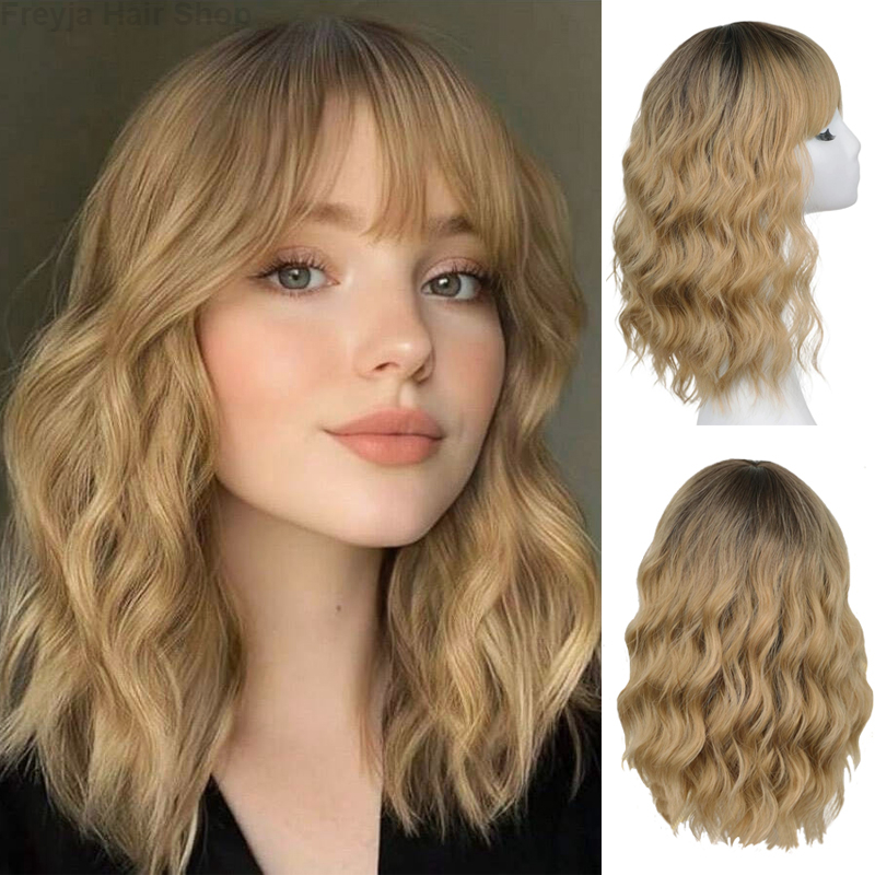 【HOT SALE】Beach Wave hair topper with Shaggy Bangs | Shoulder length | Natural and soft hair | 16 inch | 3 colors | Breathable Silk Base | Natural seamlike human scalp