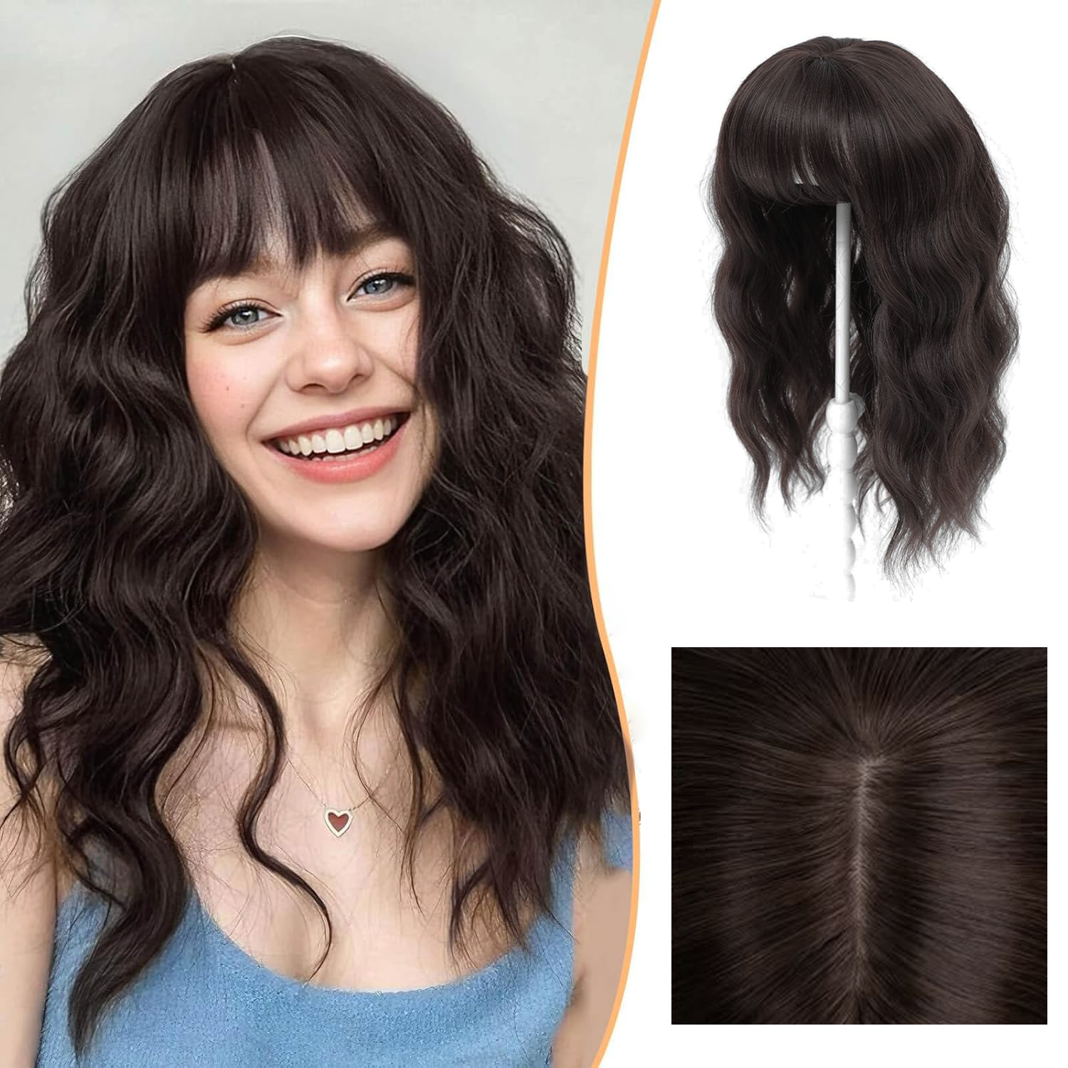 【HOT SALE】Casual Wavy Hair Topper with Bangs | 12 Colors | 8-24 inch | Heat Friendly | Easy to Wear | As Natural as Your Own Hair | Breathable Silk Base | Natural seamlike human scalp